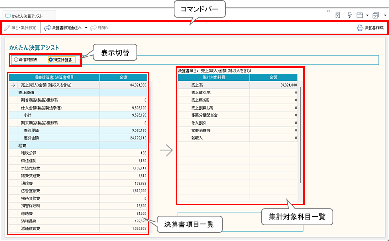 [かんたん決算アシスト]ウィンドウを使うと、決算書作成(印刷)する前の確認を手軽に行うことができます。