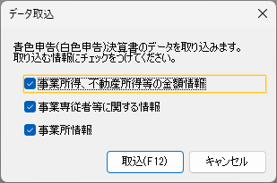 チェックを付けると、事業所得、不動産所得、青色申告特別控除、専従者給与(控除)額の合計額などの金額情報を取り込みます。 |