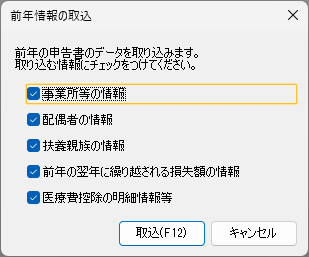[所得税確定申告書]ウィンドウのコマンドバーの[取込]→[前年情報の取込]ボタンをクリックし、表示されるダイアログで取り込む情報にチェックを付け[取込]ボタンをクリックします。