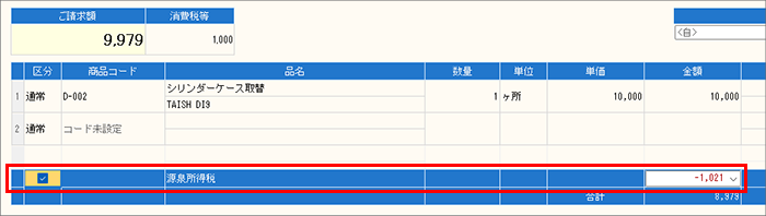 [請求書]ウィンドウで入力した明細合計額より、源泉所得税額が自動計算されます。
