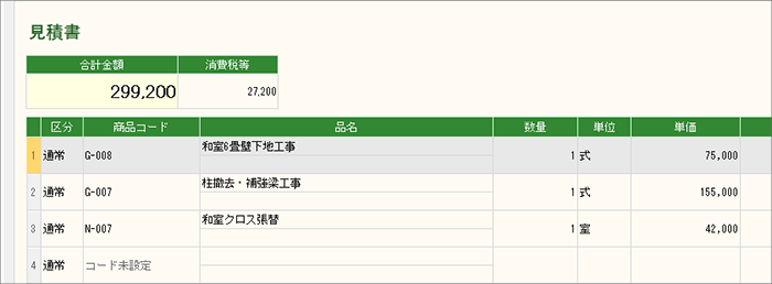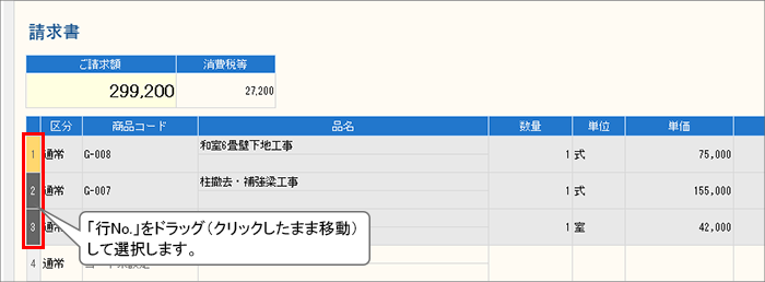 1. 作成済みの請求書を表示し、見積書にコピーしたい明細行の行セレクタ(区分左横の「行No.」が表示された四角い領域)を選択します。