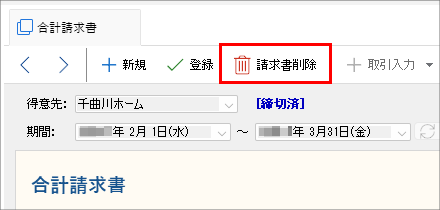 削除ができるのは、該当する得意先の最終請求(期間の日付が一番新しい合計請求書)のみです。