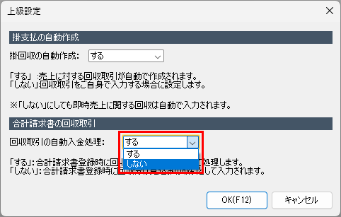 自動入金処理を「しない」に設定した場合、設定以降に登録した合計請求書では回収取引は自動で入金処理されません。ご自身で入金処理を行ってください。