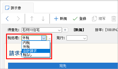 日々の売上取引(請求書や納品書)の[税処理]を「外税」または「内税」とした場合、合計請求書の[消費税等]欄には、日々作成した売上取引の積み上げの金額が表示されます。