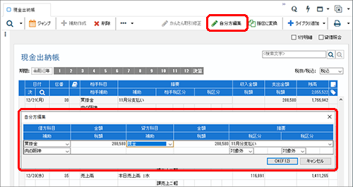 自分方編集では、現在表示中のウィンドウを切り替えずに科目や摘要項目を変更できるため、わざわざ目的の仕訳を[仕訳日記帳]ウィンドウなどから探して修正する手間を省くことができます。