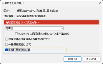 注記項目の多くには文例(一般的な記載例)が用意されており、記載例を利用すると手軽に個別注記表が作成できます。