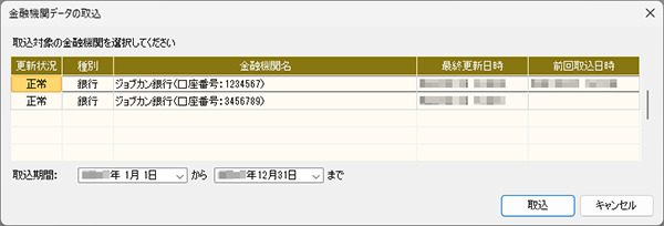 | 3. | [金融機関データの取込]ダイアログが表示されるので、取込対象の金融機関を選択して取込期間を指定します。 |