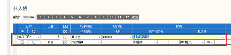| 3. | 最終行が入力できる状態になるので、仕入に関する取引の内容を入力します。 |
