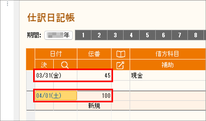 仕訳の伝票番号は、取引を入力する際、月ごとに1からの連番で自動的に振られます(付番)。