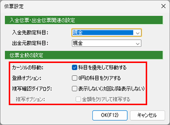 [科目を優先して移動する]にチェックを付けると、振替伝票で[Enter]キーや[Tab]キーを押したときに、移動する入力項目の順序を変更するためのものです。