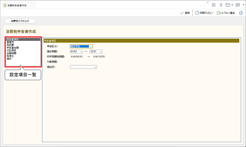 [消費税申告書作成]ウィンドウでは、課税期間の設定や「ジョブカンDesktop 会計」で集計されない金額を入力します。