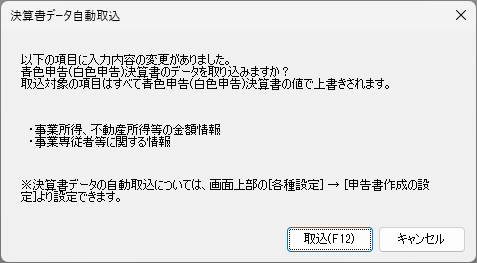 決算書を作成、または取り込み対象の情報を修正してから[所得税確定申告書]ウィンドウを表示したとき、自動取り込みのダイアログが表示されます。
