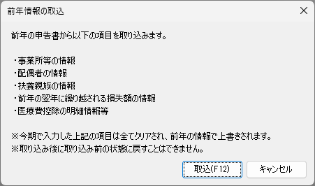 前年のデータが入力されている場合に限り、各年度で初めて[所得税確定申告書]ウィンドウを表示したとき、自動取り込みのダイアログが表示されます。