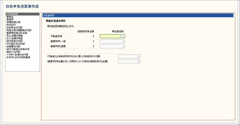 [白色申告決算書作成]ウィンドウで、収支内訳書の作成(印刷)に必要な項目を設定します。