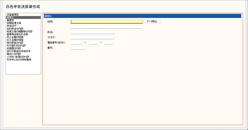 事業主の自宅の電話番号を入力します。 [データ取込]ボタンをクリックすると、[基本情報]ダイアログに入力した情報を取り込みます。 |