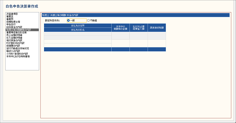 [勘定科目体系]が[一般]の時に表示されます。 入力した該当金額が表示されます。 |