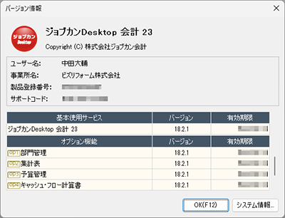 ご購入後、オプション機能が正常に導入されると、[バージョン情報]ダイアログ(ナビゲーションバーの分類[ヘルプ]から[バージョン情報]ボタンをクリック)に、ご購入いただいたオプション名が表示されます。このダイアログでは、オプション機能の有効期限もご確認いただけます。