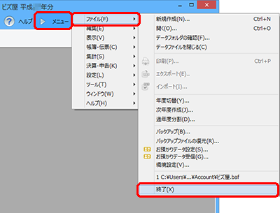 ナビゲーションバーの分類[メニュー]から、[ファイル]→[終了]をクリックします。