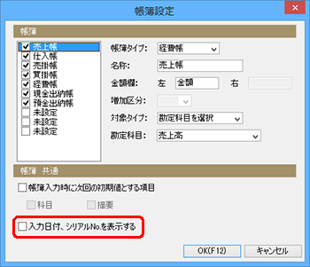 シリアルNo.と入力日付は、ナビゲーションバーの分類[メニュー]から、[設定]→[帳簿・伝票設定]→[帳簿設定]をクリックすると表示できる[帳簿設定]ダイアログで表示/非表示を設定できます。