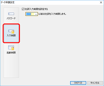 [データ保護設定]ダイアログ左にある[入力制限]ボタンをクリックし、[仕訳入力制限を設定する]にチェックを付けてから、日付を指定します。[OK]ボタンをクリックすると、設定は完了です。