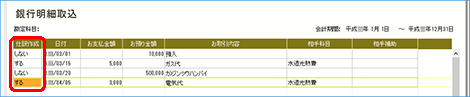 | 5. | 取り込まれたファイルの情報と明細が表示されるので、各明細に相手科目と必要に応じて補助科目を設定します。 |