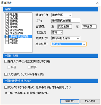 [帳簿設定]ダイアログに設定されている帳簿の種類や設定は、勘定科目体系により異なります(詳細)。
