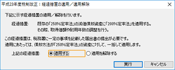 | 3. | [税制調整]ダイアログが表示されるので、[平成23年度税制改正]で「経過措置1の適用」または「経過措置2の適用」を選択します。 |