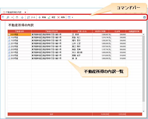 [不動産所得の内訳]ウィンドウは、「個人/不動産」、「個人/兼業(不動産所得の科目を使用する)」で会計データファイルを作成しているときのみ利用できます。その他の勘定科目体系のときは、[不動産所得の内訳]ウィンドウは使用できません。