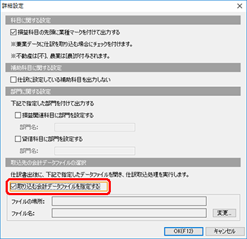 [取り込む会計データファイルを指定する]にチェックを付けます。 |