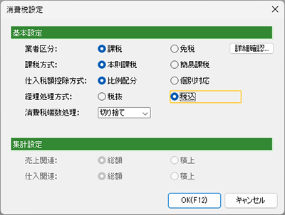 [消費税設定]ダイアログ(ナビゲーションバーの分類[メニュー]から、[設定]→[消費税設定]をクリック)で、[本則課税][比例配分][税込]を選択した時の表示項目です。