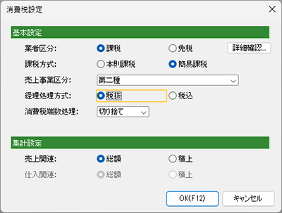 [消費税設定]ダイアログ(ナビゲーションバーの分類[メニュー]から、[設定]→[消費税設定]をクリック)で、[簡易課税][税抜]を選択した時の表示項目です。