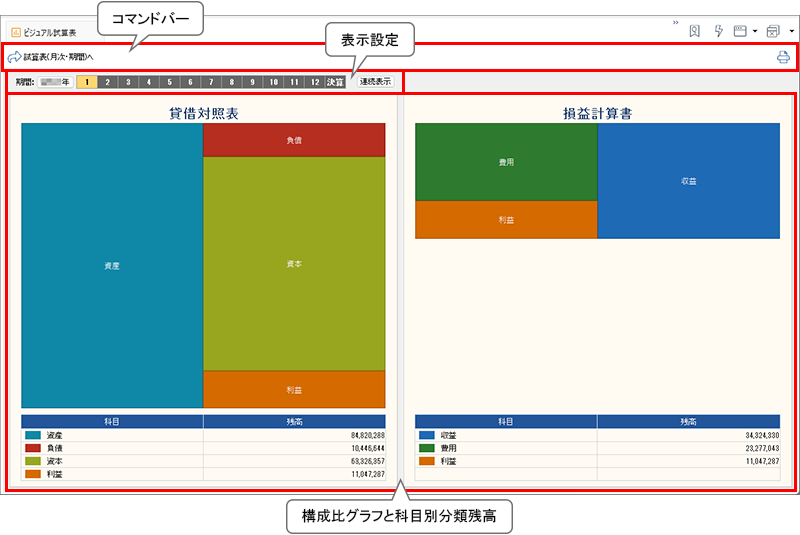 ウィンドウ下部の集計残高の中で、もっとも残高が多いものを基準とした各科目分類の構成比率を示すグラフです。左側は貸借対照表、右側は損益計算書を示しており、これらの財務諸表から算出される「利益」または「損失」が両方のグラフに表示されます。 |