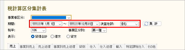 事業者区分・期間・決算仕訳の有無を指定し直したときは、再度[集計]ボタンをクリックします。事業者区分・期間・決算仕訳の有無を変更後、[集計]ボタンをクリックしていないときは、集計結果の文字や数値が灰色になります。