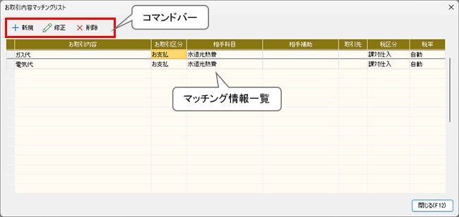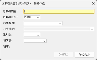 お取引内容マッチングリストへのマッチング情報の登録は、仕訳作成の際に自動的に行われますが、[お取引内容マッチングリスト]ダイアログでは新規作成、修正が可能です。