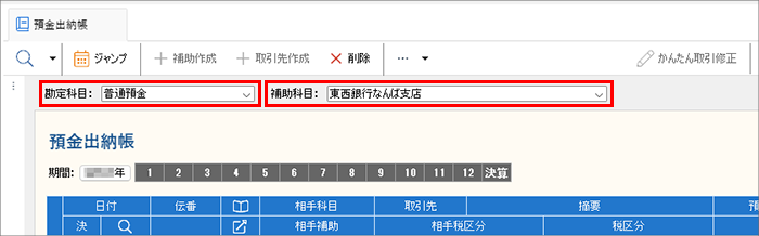 ここでの操作例は、初期設定のときのものです。[帳簿設定]ダイアログで[預金出納帳]ウィンドウの設定を変更しているときは異なります。