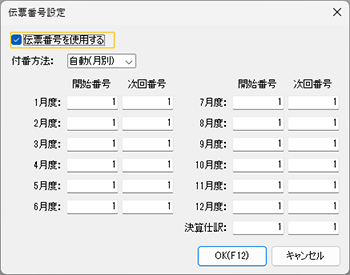 当期会計期間を通じて、[次回番号]の伝票番号を開始番号とした連番が、自動的に振られていきます。次年度の会計期間では、[次回番号]は「1」に戻ります。