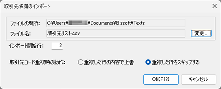 | 3. | [取引先名簿のインポート]ダイアログが表示されるので、[変更]ボタンをクリックして、取り込むファイルを指定します。 |