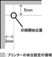 たとえば、[上]に5mm、[左]に3mmを指定したときは、下図の破線の交差する位置が、印刷開始位置となります。基本的にこの項目を変更する必要はありません。