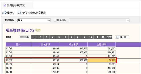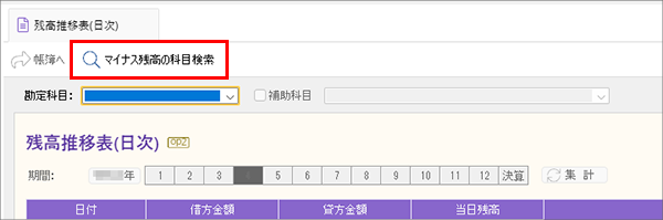 [残高推移表(日次)]ウィンドウで、マイナス残高になっている科目を検索することができます。