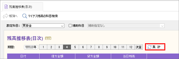 | 1. | ナビゲーションバーの分類[メニュー]から、[集計]→[集計表オプション]→[残高推移表(日次)]をクリックします。 |