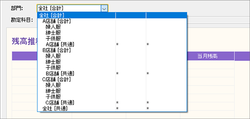 部門管理オプションを導入しているときは、[勘定科目]の上に部門を選択する項目が表示されます。