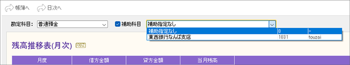 | 2. | [残高推移表(月次)]ウィンドウが表示されるので、[勘定科目]で集計対象の科目を選択します。 |