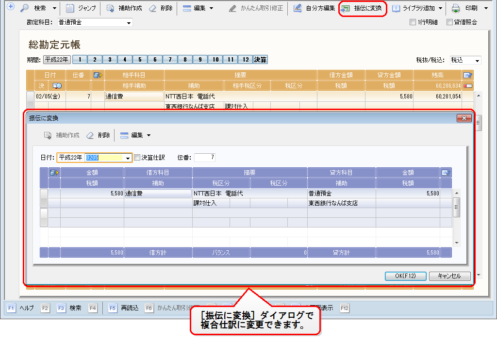 仕訳の内容を確認しているときに、複合仕訳に変更したい仕訳を見つけたときは、[総勘定元帳]ウィンドウ・[補助元帳]ウィンドウで振替伝票に変更することができます。