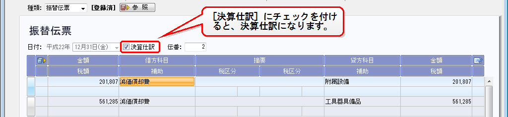 決算仕訳は、帳簿や[伝票]ウィンドウから入力します。通常の仕訳と決算仕訳は、区別されます。試算表・消費税集計表では、決算仕訳を除いて集計したり、決算仕訳のみを集計することもできます。