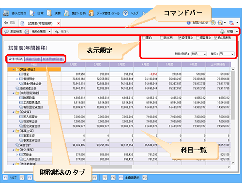 科目別に集計した残高を、当期内の月ごとに見たいときは、[試算表(年間推移)]ウィンドウを利用します。