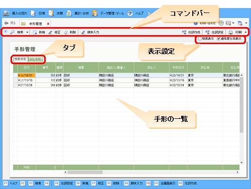 [日付] | [受取手形]タブでは手形を受け取った日付、[支払手形]タブでは手形を振り出した日付が表示されます。 | |