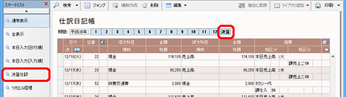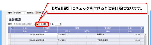 決算仕訳は、帳簿や[伝票]ウィンドウから入力します。通常の仕訳と決算仕訳は、区別されます。試算表・消費税集計表では、決算仕訳を除いて集計したり、決算仕訳のみを集計することもできます。