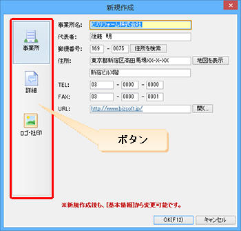 | 2. | [新規作成]ダイアログが表示されます。 [事業所]ボタンをクリックすると、[事業所]ページの項目に切り替わります。このページでは、自社の住所や電話番号などを入力します。 |