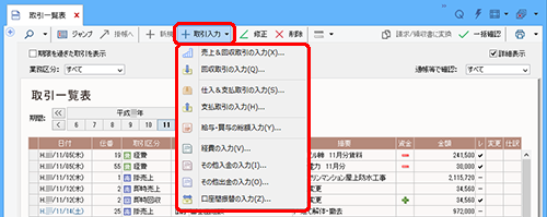 | ・ | コマンドバーの[取引入力]ボタンをクリックし、[○○の入力]ボタンをクリック |