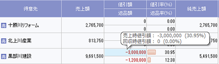 集計一覧の[値引額][値引率(%)]にマウスカーソルを合わせると、売上時(仕入時)と回収時(支払時)の値引額の内訳をポップアップで確認できます。